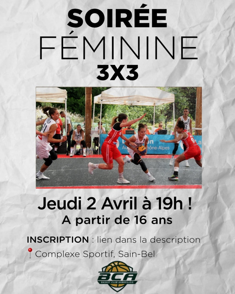 Le club vous invite à une initiation au 3×3 le jeudi 2 avril à 19 heures, au gymnase de la CCPA ! (569 Allée de Grands Champs, à Sain-Bel).